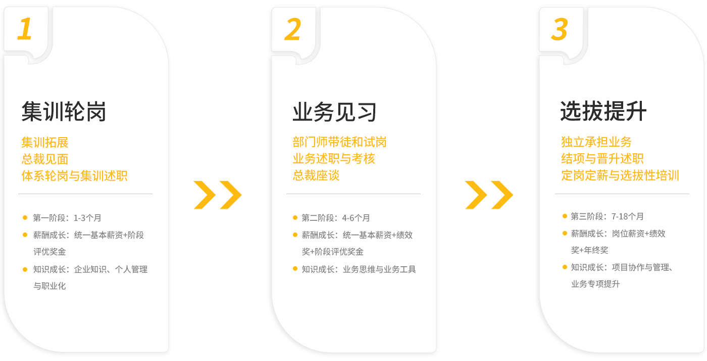 面試結果決定同學們是否能成為世友管培生。被錄取的同學,薪資成長將分為以下三階段:(1-3個月):統一基本薪資+階段性評分獎勵;(4-6個月):統一基本薪資+績效工資+階段性考核獎;(7月以后):會根據部門及確定崗位的特質確定不同的薪資標準。